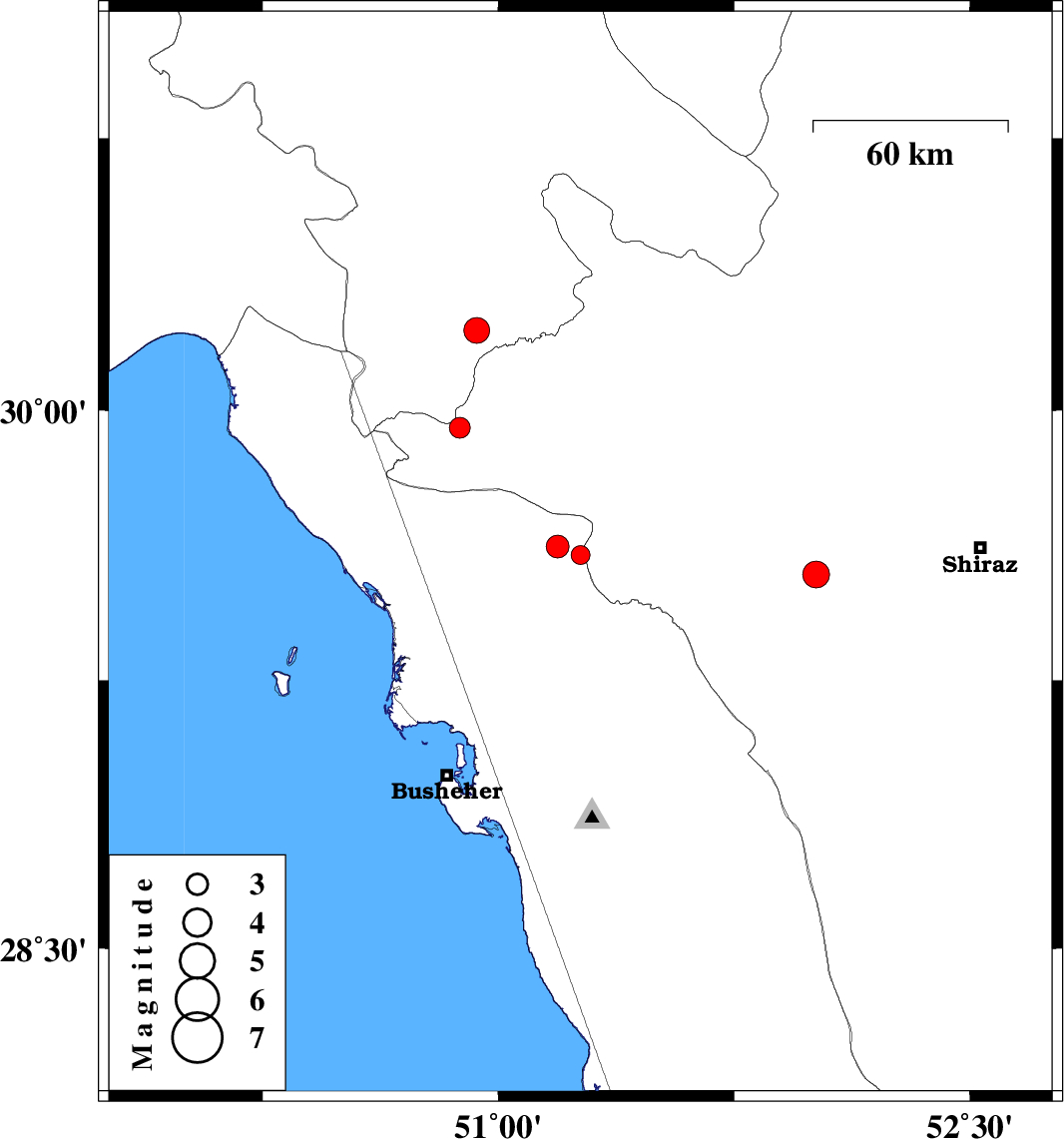 | 2018/12/13 | 12:29:09.7 | 15:59:09.7 | 29.599 | 51.261 | 17 | ML2.7 | Bushehr Province, 38 km North of Borazjan | ||