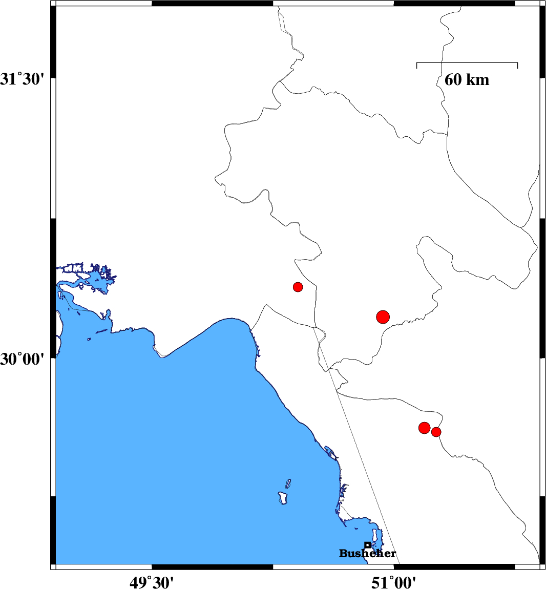 2018/12/13 | 12:29:09.7 | 15:59:09.7 | 29.599 | 51.261 | 17 | ML2.7 | Bushehr Province, 38 km North of Borazjan | ||