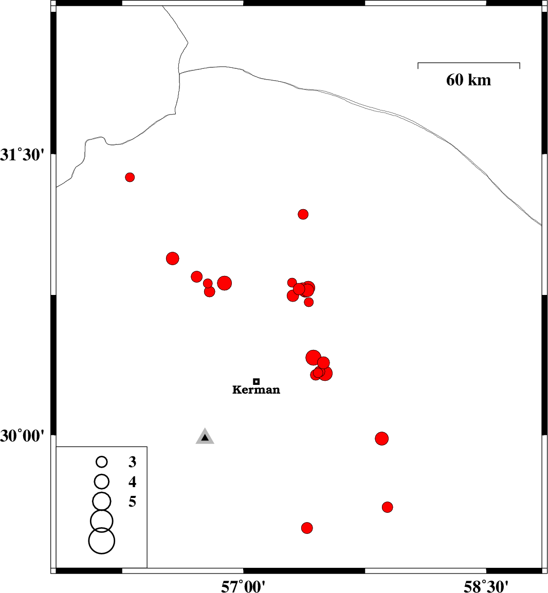 | 2018/12/22 | 14:05:10.6 | 17:35:10.6 | 30.782 | 57.342 | 14 | ML3.3 | Kerman Province, 60 km North-East of Kerman | ||