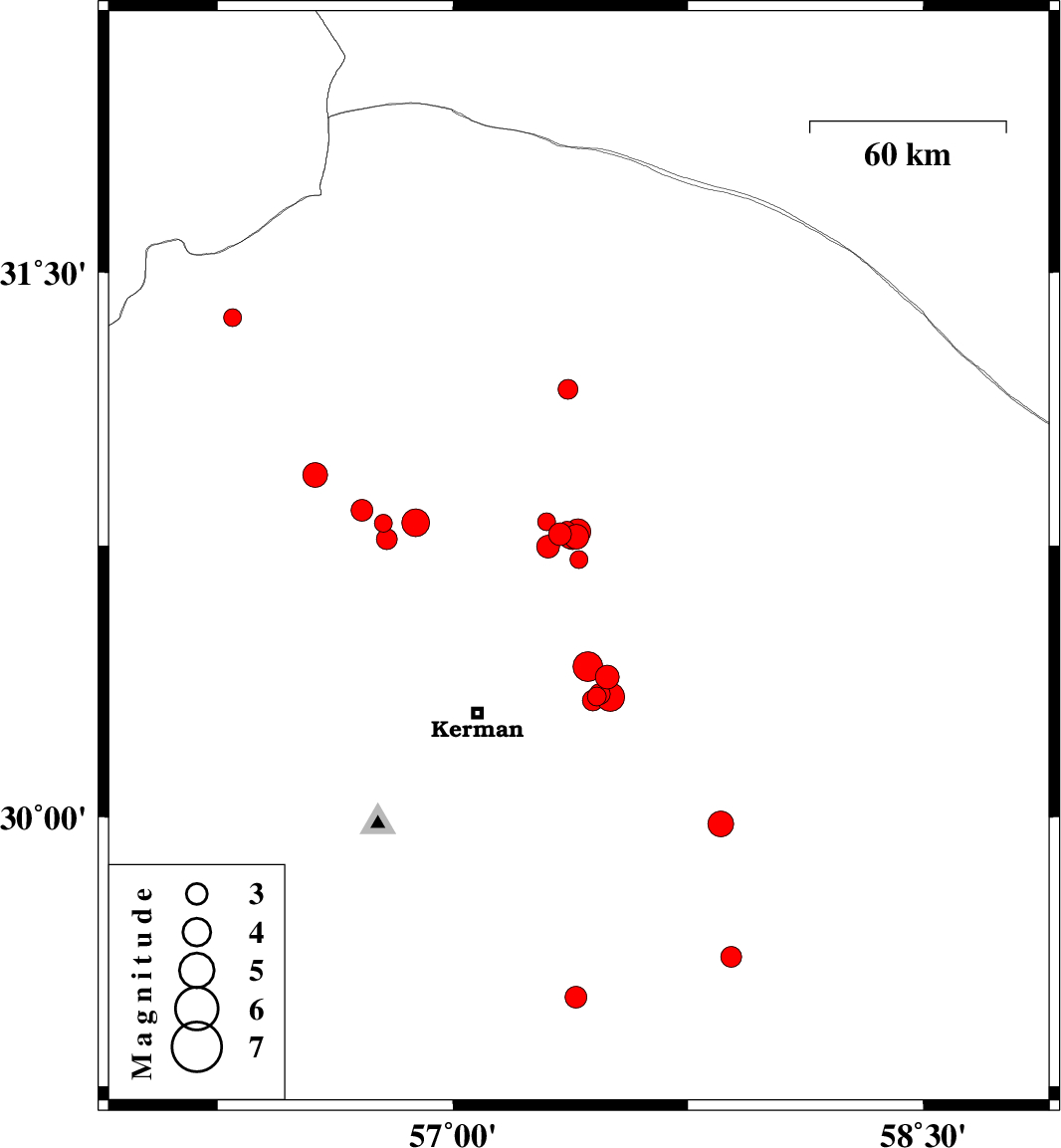 | 2018/12/22 | 14:05:10.6 | 17:35:10.6 | 30.782 | 57.342 | 14 | ML3.3 | Kerman Province, 60 km North-East of Kerman | ||
