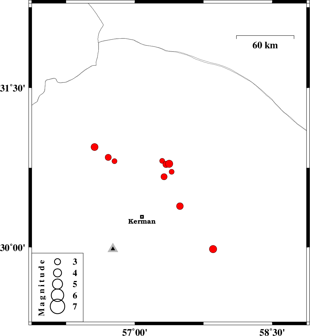 | 2018/12/19 | 03:32:31.6 | 07:02:31.6 | 29.981 | 57.854 | 14 | ML3.7 | Kerman Province, 82 km South-East of Kerman |