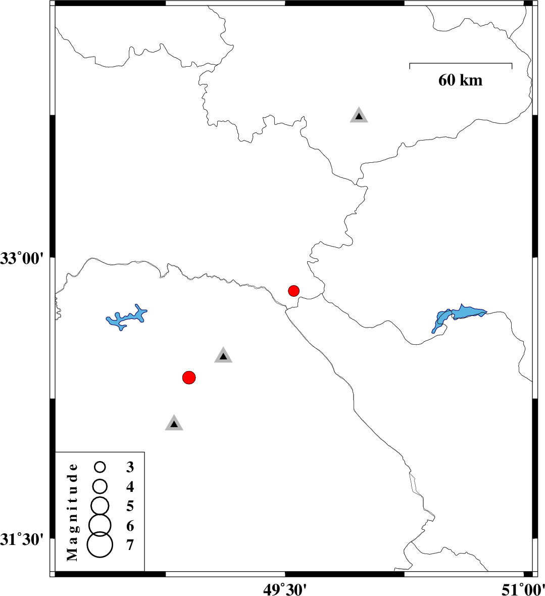 | 2018/12/28 | 09:44:20.3 | 13:14:20.3 | 32.822 | 49.554 | 14 | ML3.1 | Lorestan Province, 54 km South-West of Fereydunshahr | ||
