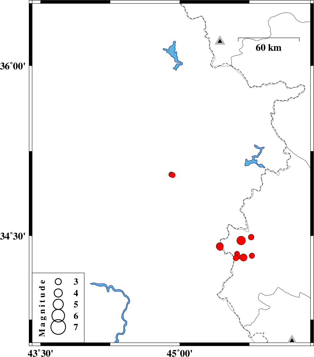 | 2018/12/22 | 23:45:20.2 | 03:15:20.2 | 34.34 | 45.617 | 15 | ML2.6 | Kermanshah Province, 20 km South of Qasr-E-Shirin |