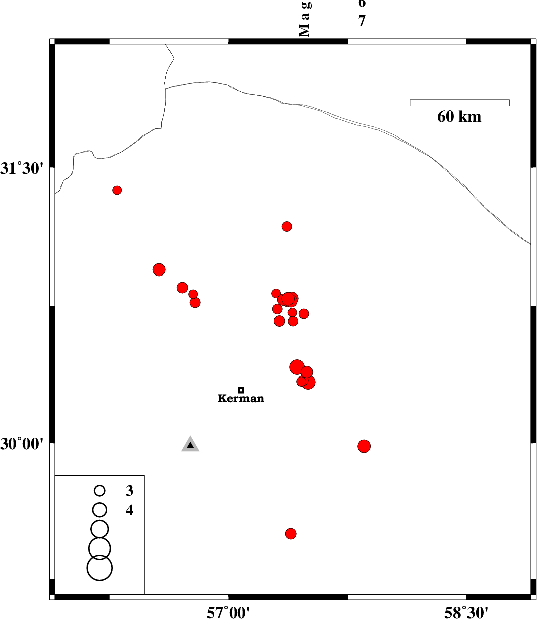 | 2018/12/22 | 14:05:10.6 | 17:35:10.6 | 30.782 | 57.342 | 14 | ML3.3 | Kerman Province, 60 km North-East of Kerman | ||
