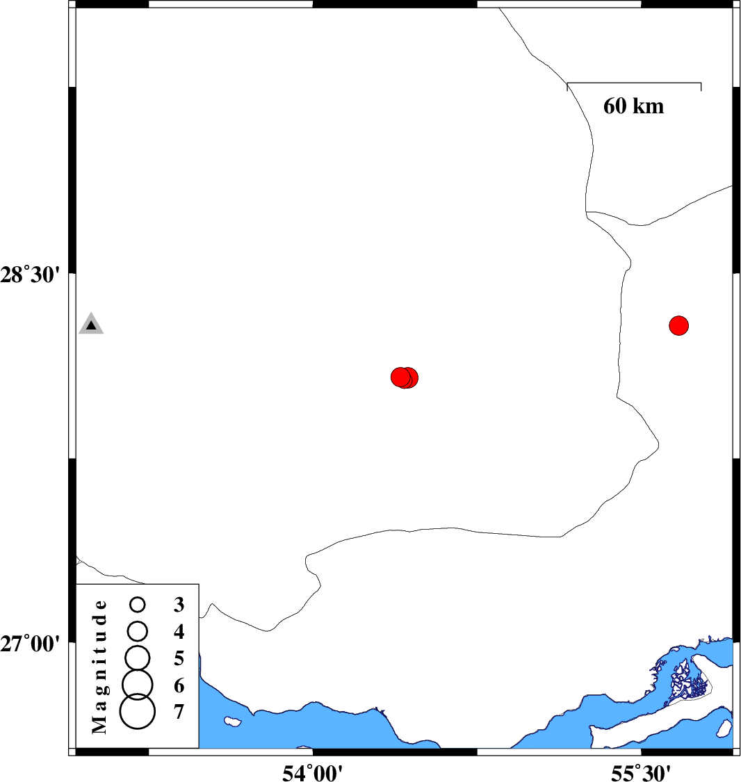| 2019/01/02 | 15:39:33.1 | 19:09:33.1 | 28.078 | 54.433 | 15 | ML4.3 | Fars Province, 45 km North of Lar | ||