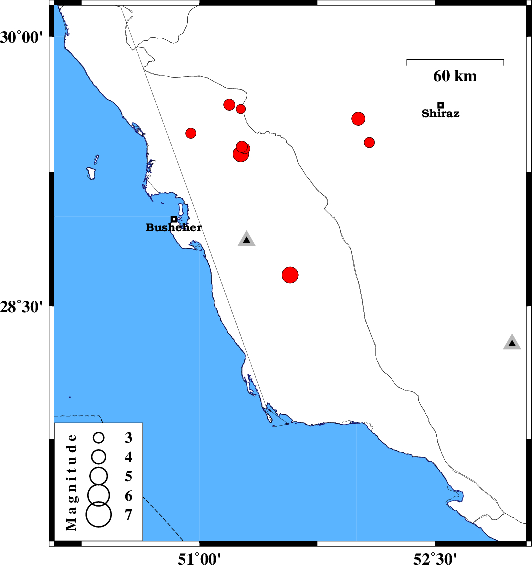 | 2018/12/13 | 12:29:09.7 | 15:59:09.7 | 29.599 | 51.261 | 17 | ML2.7 | Bushehr Province, 38 km North of Borazjan | ||