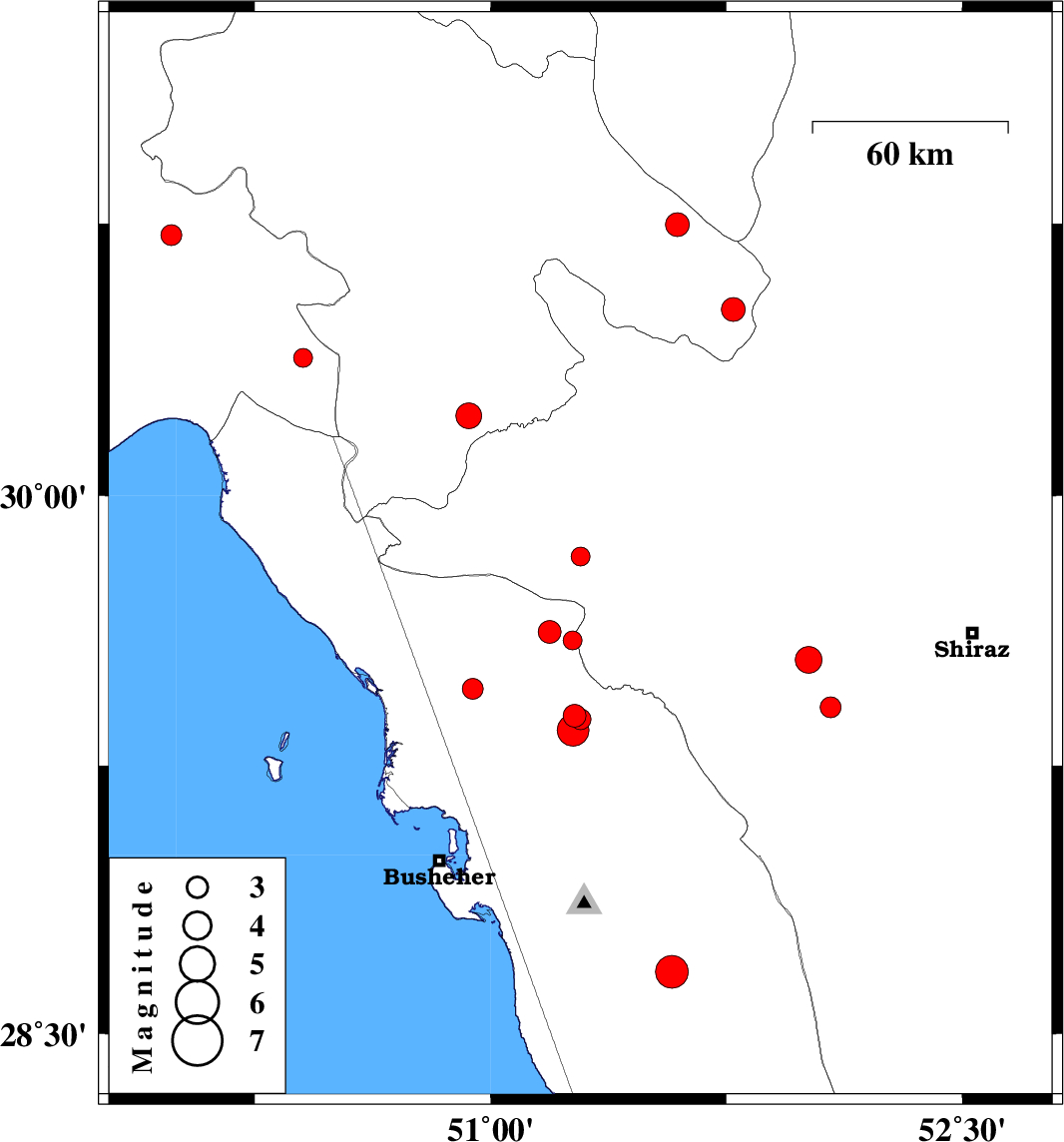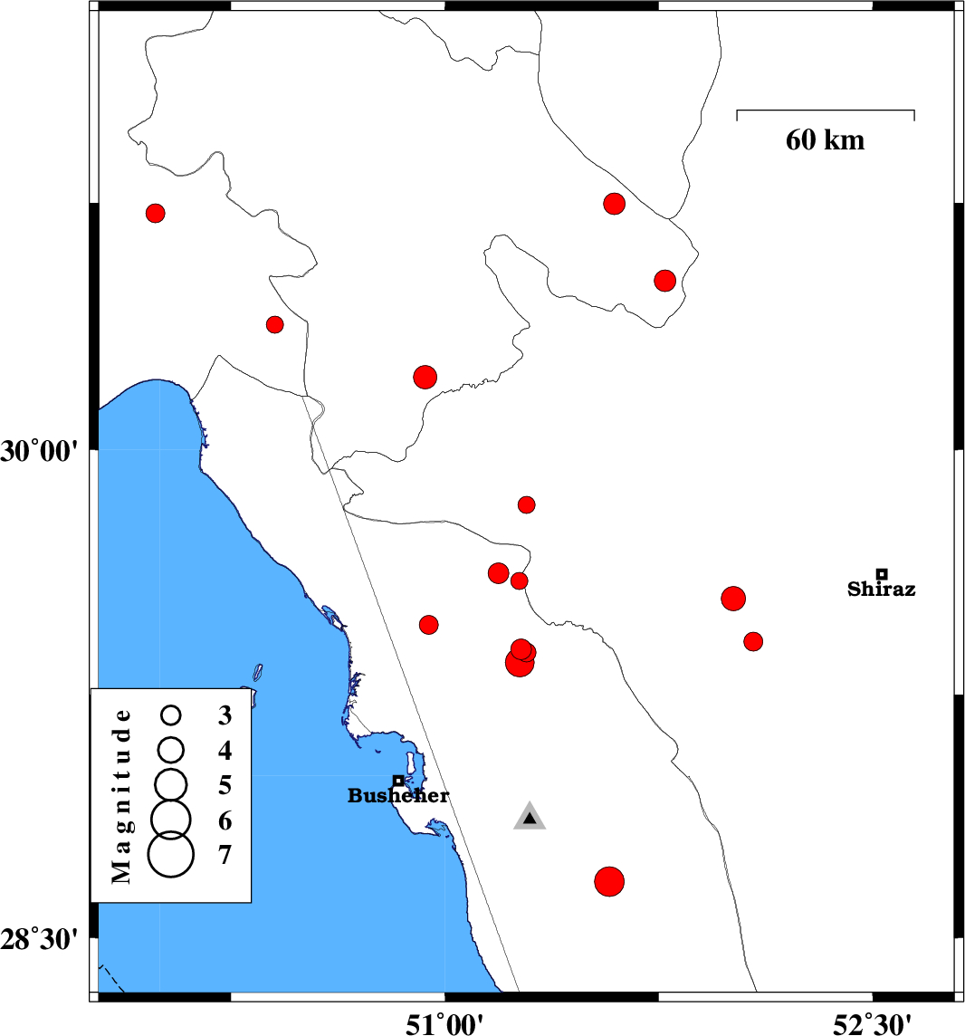 | 2019/01/04 | 16:05:14.1 | 19:35:14.1 | 29.379 | 51.286 | 14 | ML2.9 | Bushehr Province, 15 km North of Borazjan | ||