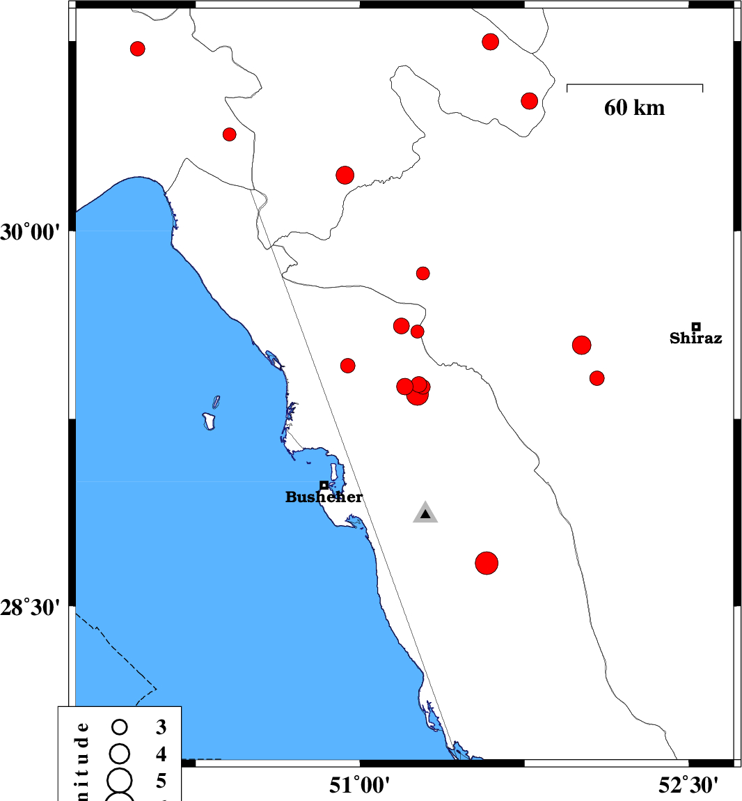 | 2019/01/04 | 16:05:14.1 | 19:35:14.1 | 29.379 | 51.286 | 14 | ML2.9 | Bushehr Province, 15 km North of Borazjan | ||