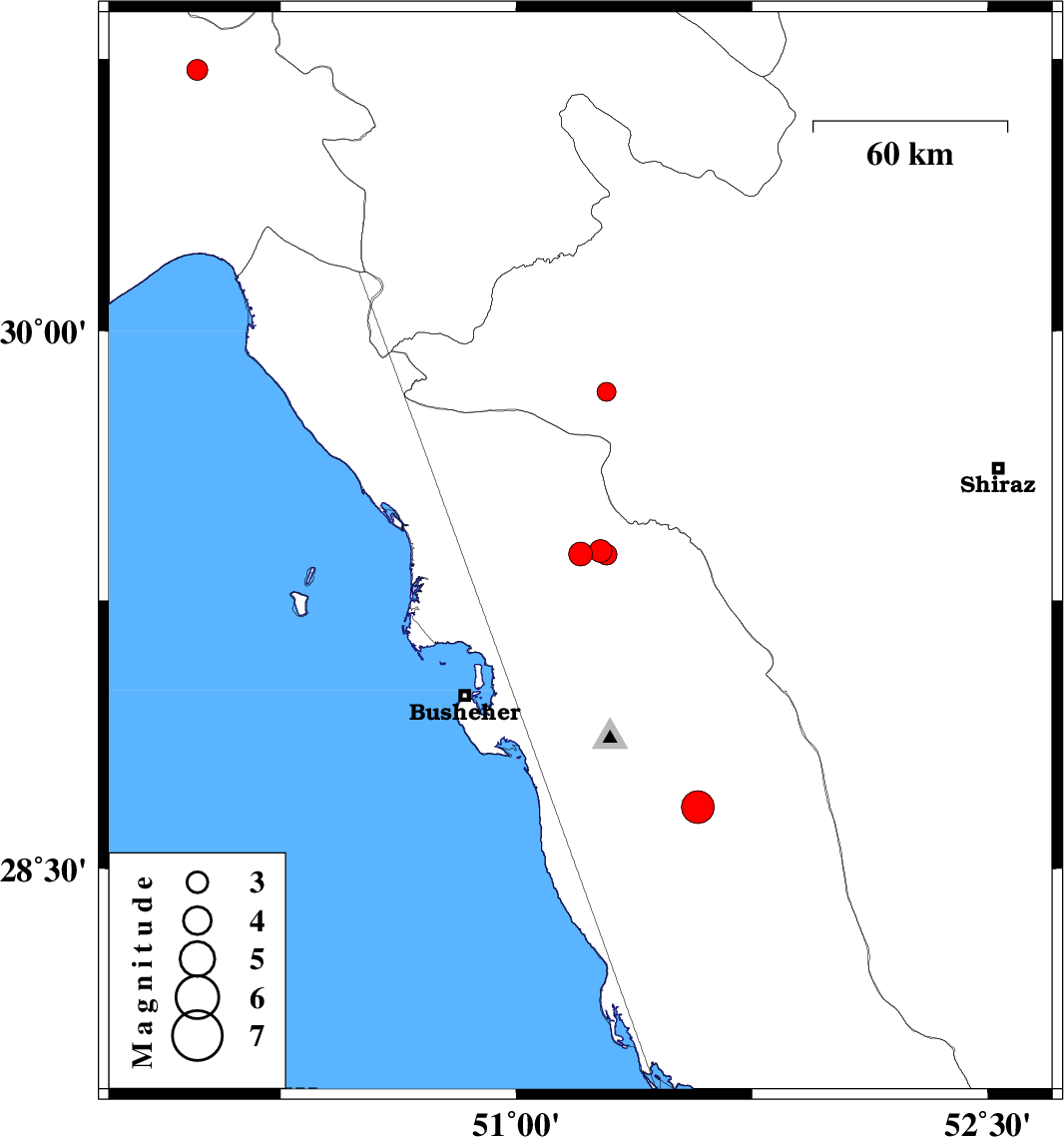 | 2019/01/04 | 16:05:14.1 | 19:35:14.1 | 29.379 | 51.286 | 14 | ML2.9 | Bushehr Province, 15 km North of Borazjan |