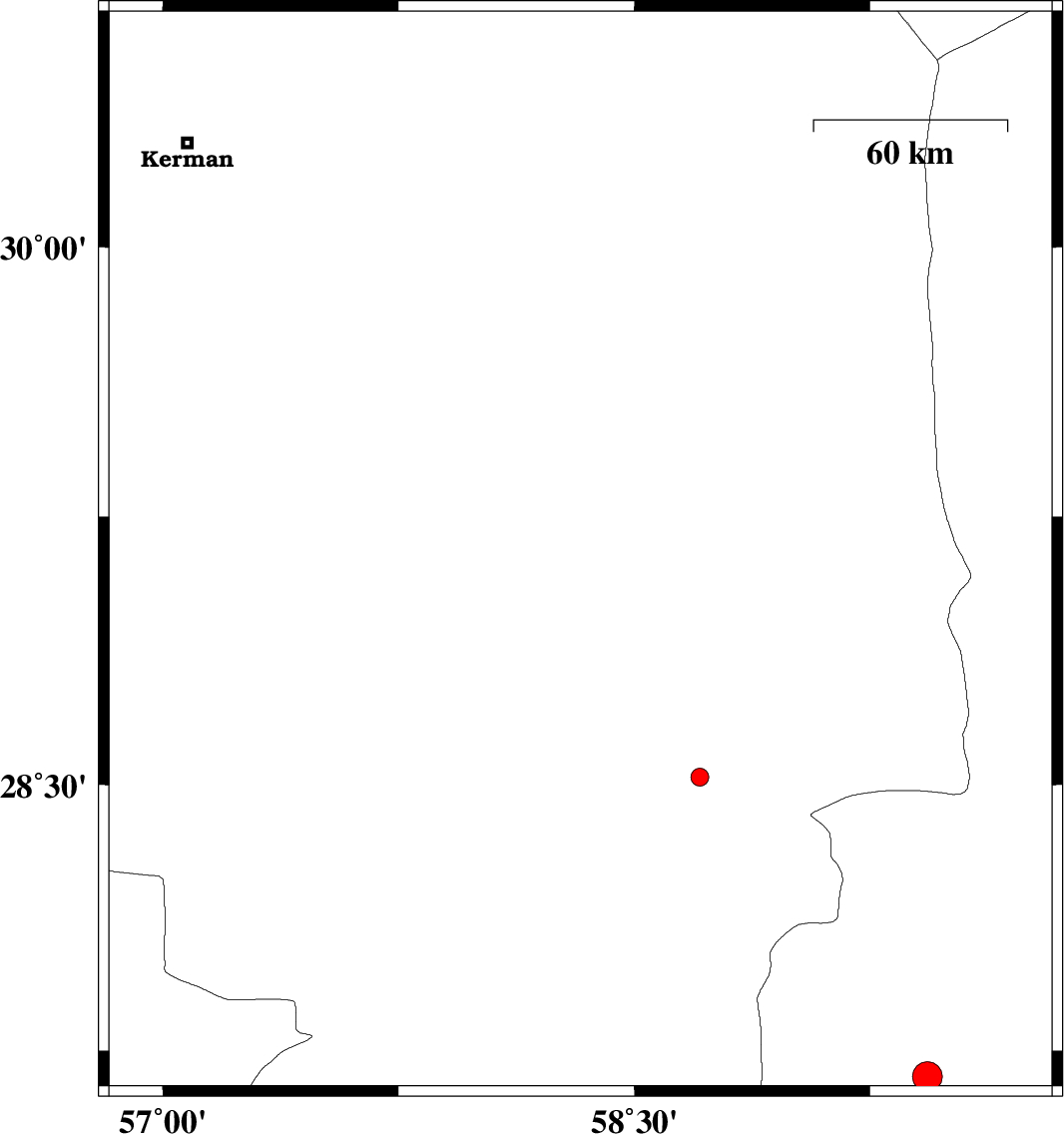 | 2019/01/14 | 01:27:13.9 | 04:57:13.9 | 29.151 | 58.329 | 14 | ML4.2 | Kerman Province, 5 km of Bam | ||