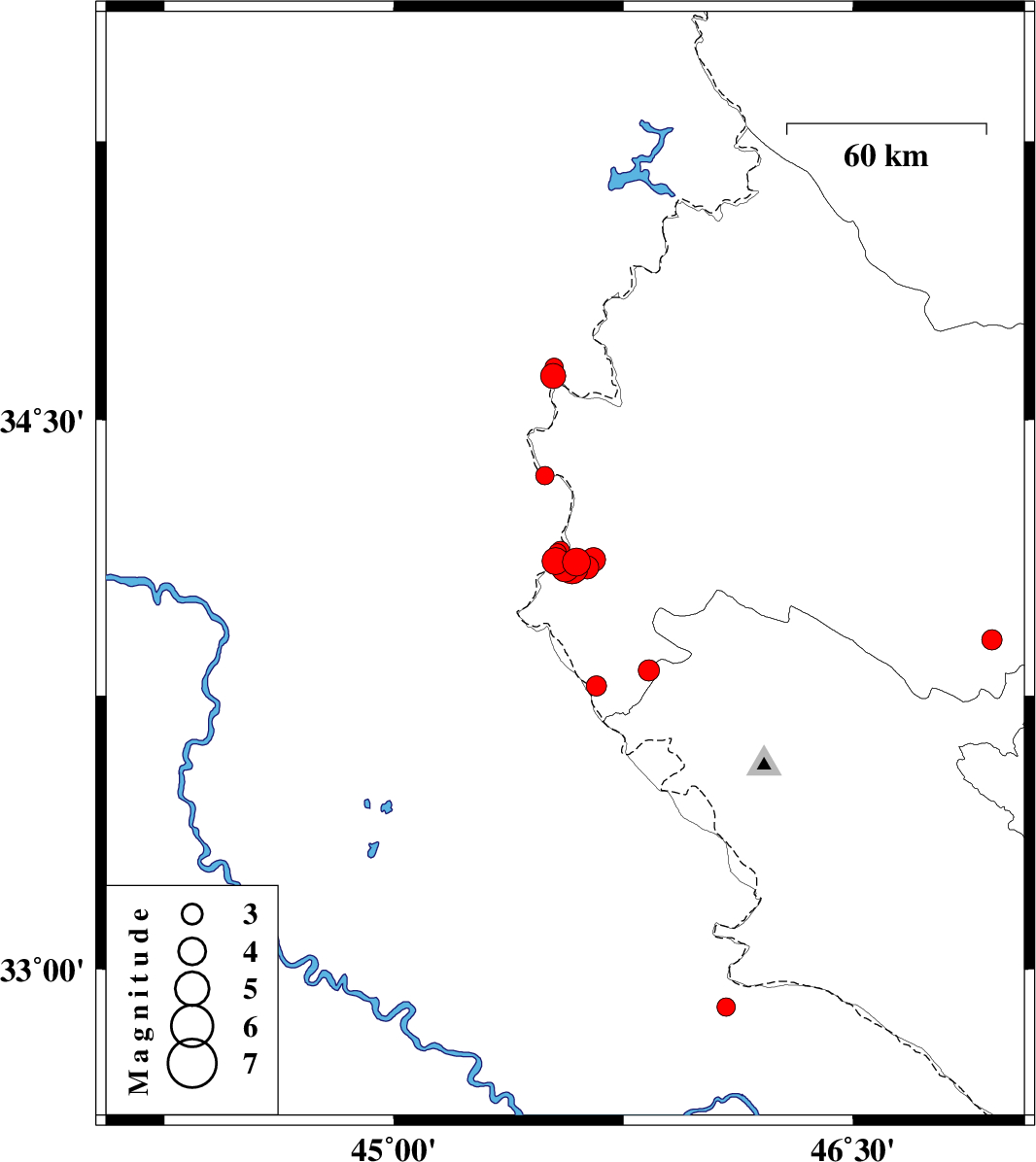 | 2019/01/15 | 01:55:04.6 | 05:25:04.6 | 34.642 | 45.523 | 17 | ML2.7 | Iraq, 15 km North of Qasr-E-Shirin | ||