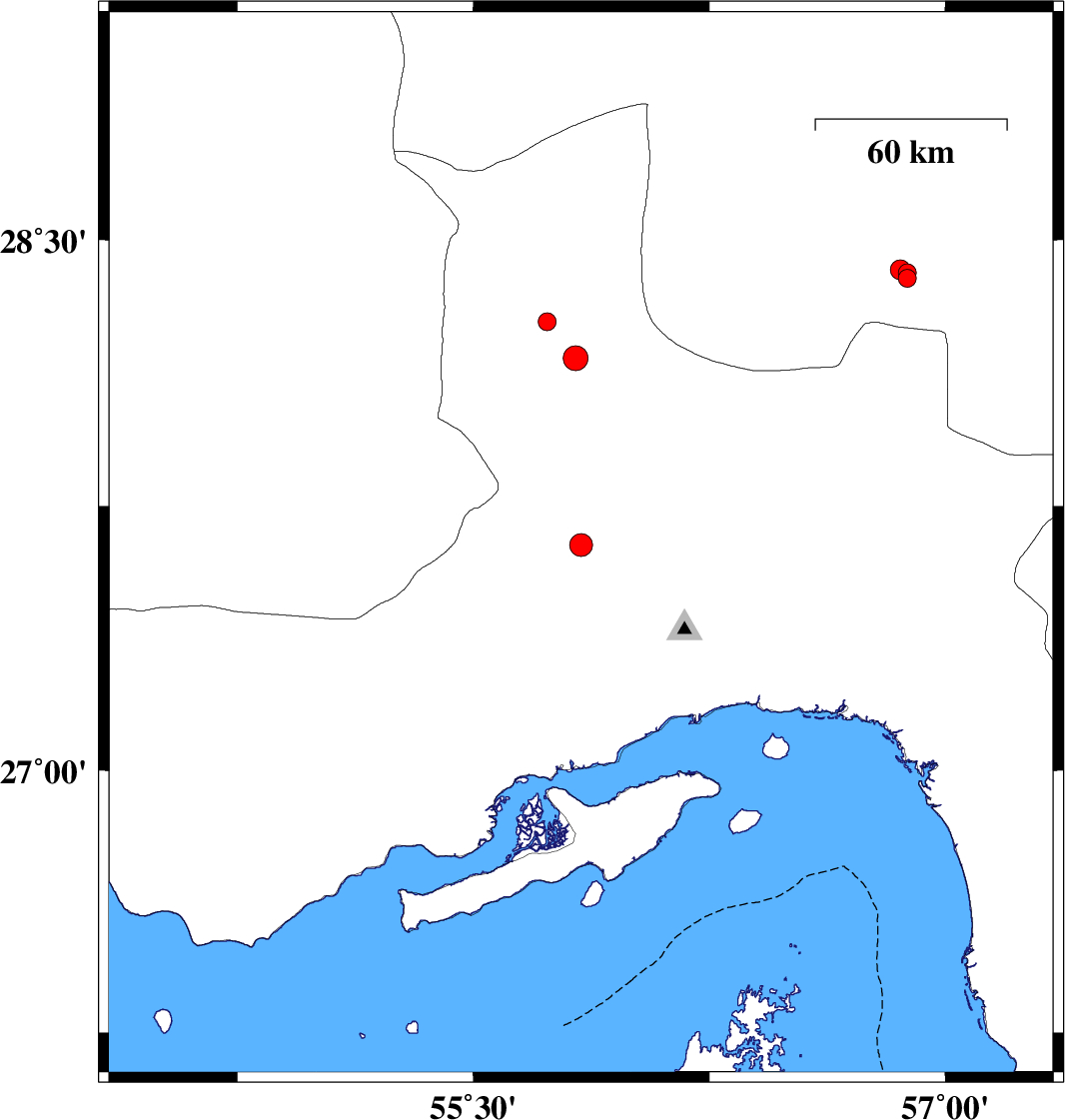 | 2019/01/07 | 22:54:28.5 | 02:24:28.5 | 28.407 | 56.879 | 14 | ML2.6 | Kerman Province, 96 km -East of Hajiabad | ||