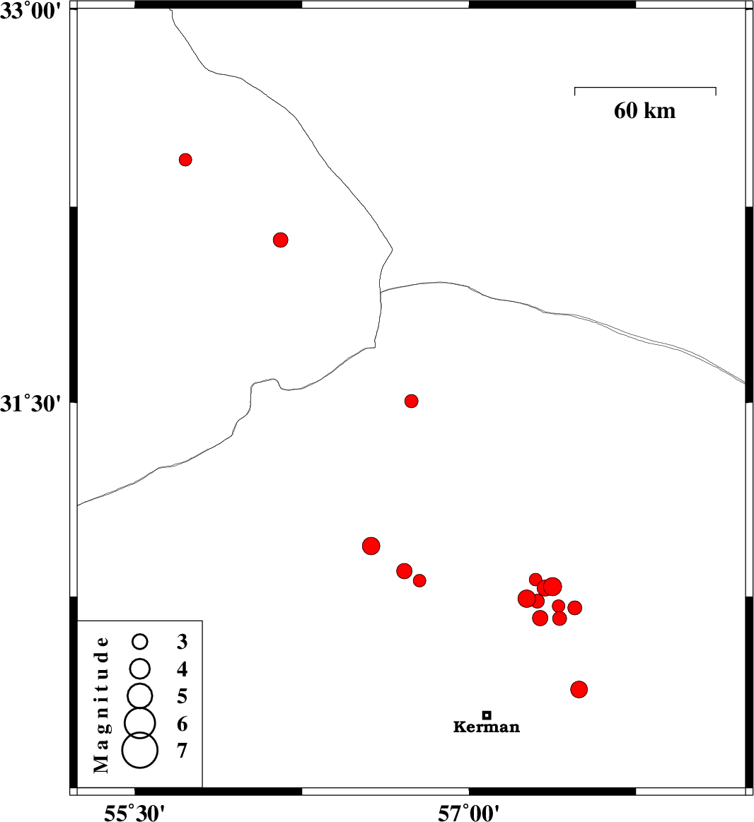 | 2019/01/15 | 23:52:30.7 | 03:22:30.7 | 30.741 | 57.259 | 14 | ML3.5 | Kerman Province, 53 km North-East of Kerman | ||