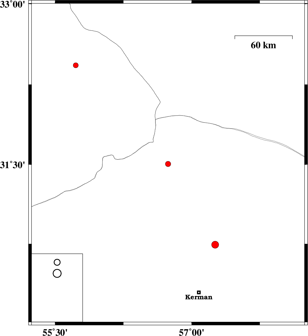 | 2019/01/15 | 23:52:30.7 | 03:22:30.7 | 30.741 | 57.259 | 14 | ML3.5 | Kerman Province, 53 km North-East of Kerman | ||