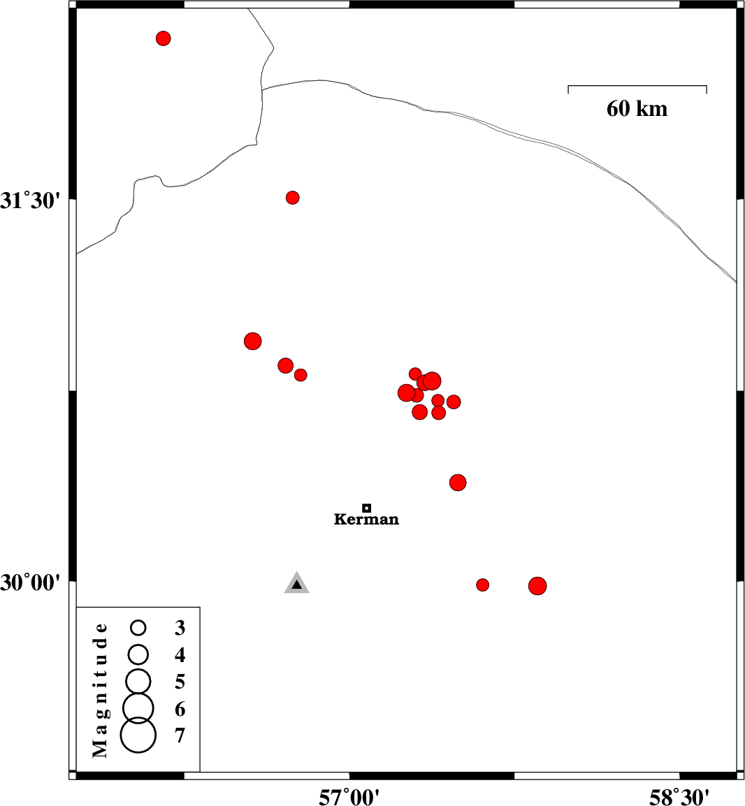 | 2018/12/19 | 03:32:31.6 | 07:02:31.6 | 29.981 | 57.854 | 14 | ML3.7 | Kerman Province, 82 km South-East of Kerman |