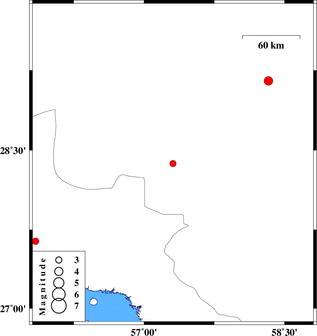 | 2019/01/14 | 01:27:13.9 | 04:57:13.9 | 29.151 | 58.329 | 14 | ML4.2 | Kerman Province, 5 km of Bam |
