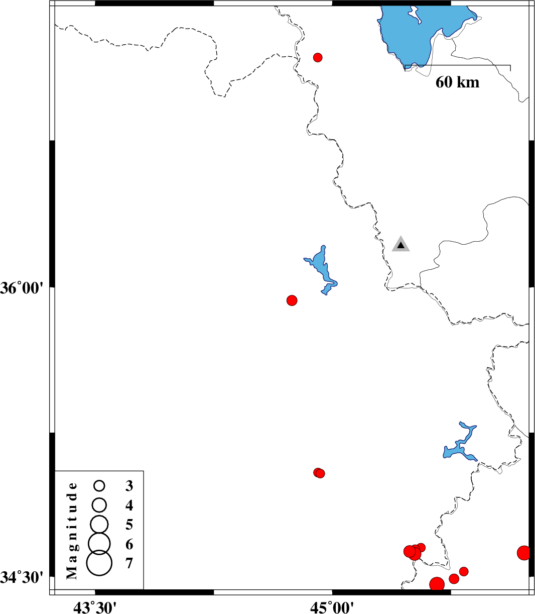 | 2019/01/15 | 01:55:04.6 | 05:25:04.6 | 34.642 | 45.523 | 17 | ML2.7 | Iraq, 15 km North of Qasr-E-Shirin | ||