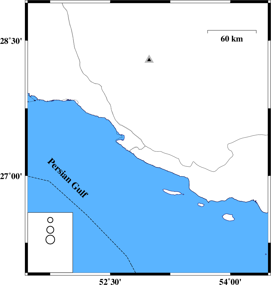 | 2019/01/19 | 05:48:29.4 | 09:18:29.4 | 27.413 | 52.97 | 15 | ML3 | Fars Province, 17 km South of Mehr |