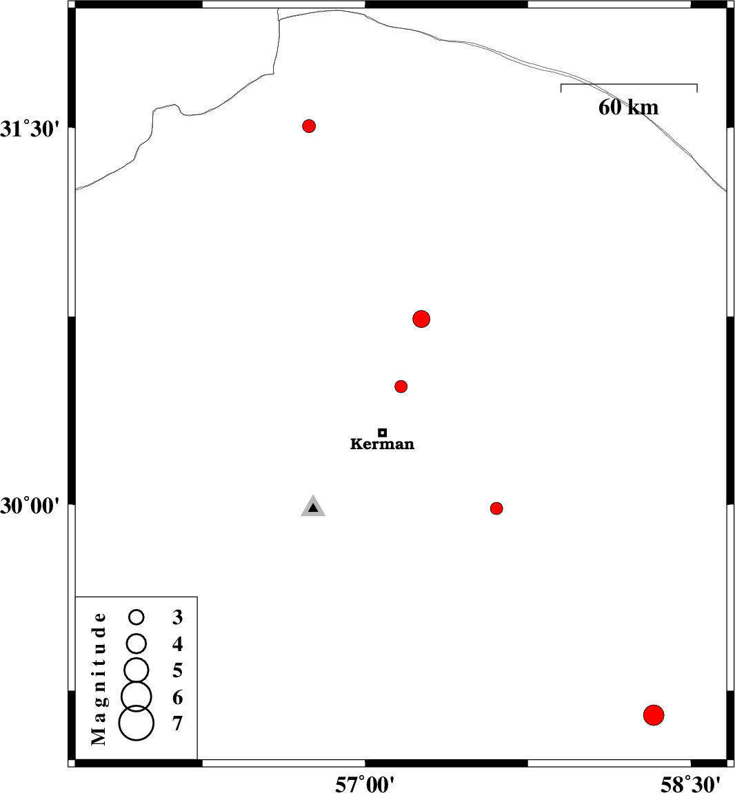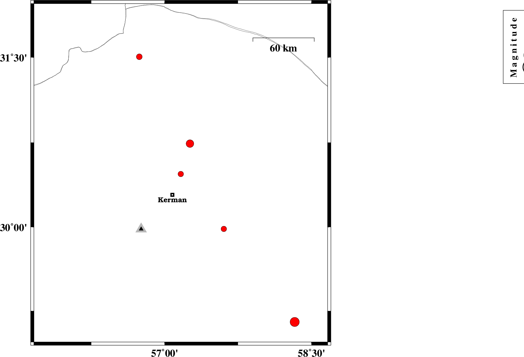 | 2019/01/14 | 01:27:13.9 | 04:57:13.9 | 29.151 | 58.329 | 14 | ML4.2 | Kerman Province, 5 km of Bam | ||