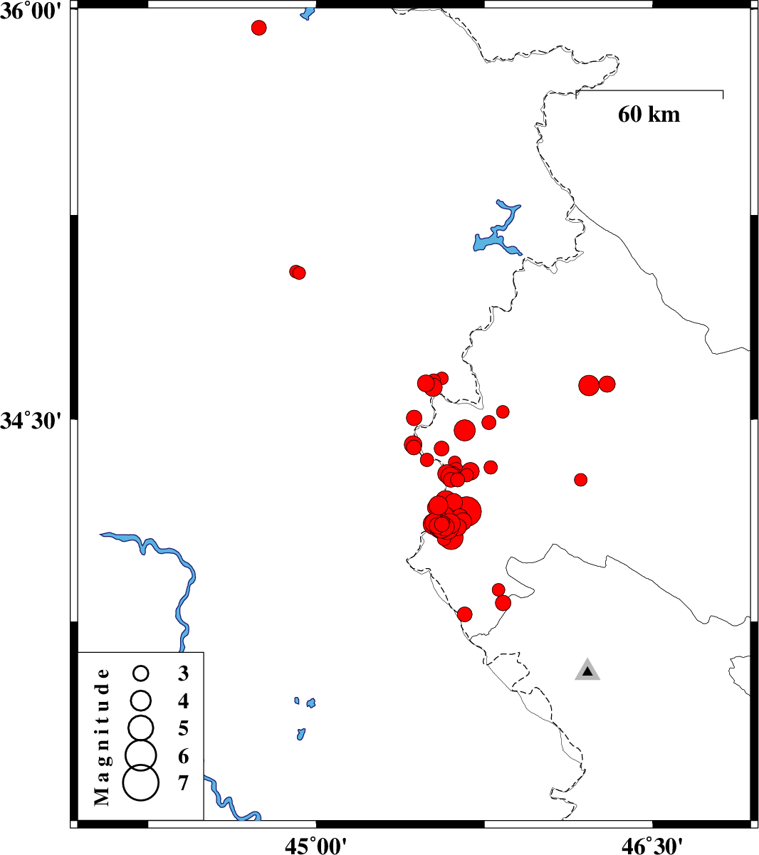 2019/01/06 | 14:03:55.1 | 17:33:55.1 | 34.09 | 45.577 | 14 | ML:3.5 | Kermanshah Province, 32 km -West of Gilan-E-Gharb | ||