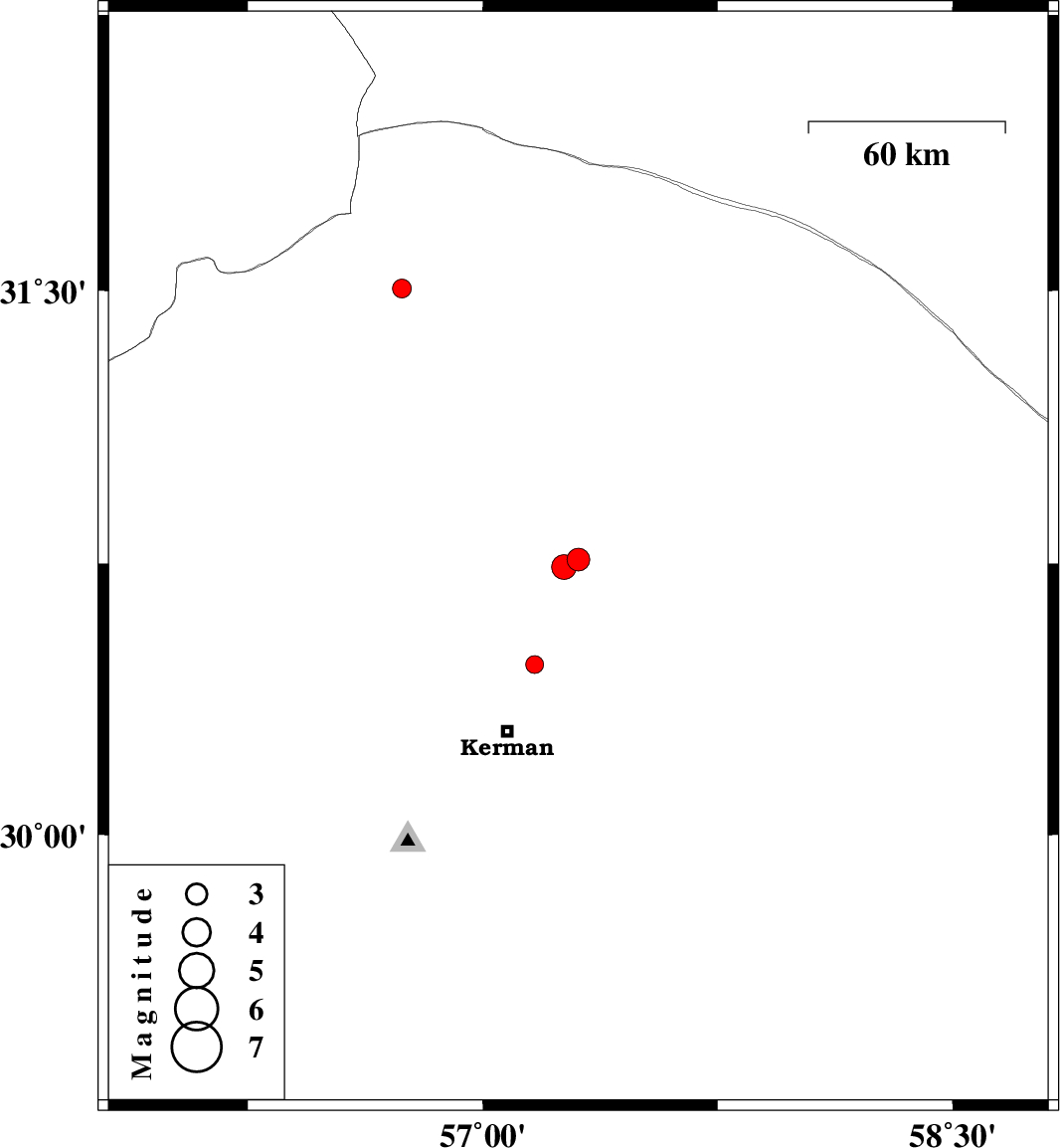 2019/01/21 | 18:49:01.6 | 22:19:01.6 | 30.761 | 57.305 | 14 | ML:3.2 | Kerman Province, 57 km North-East of Kerman | ||