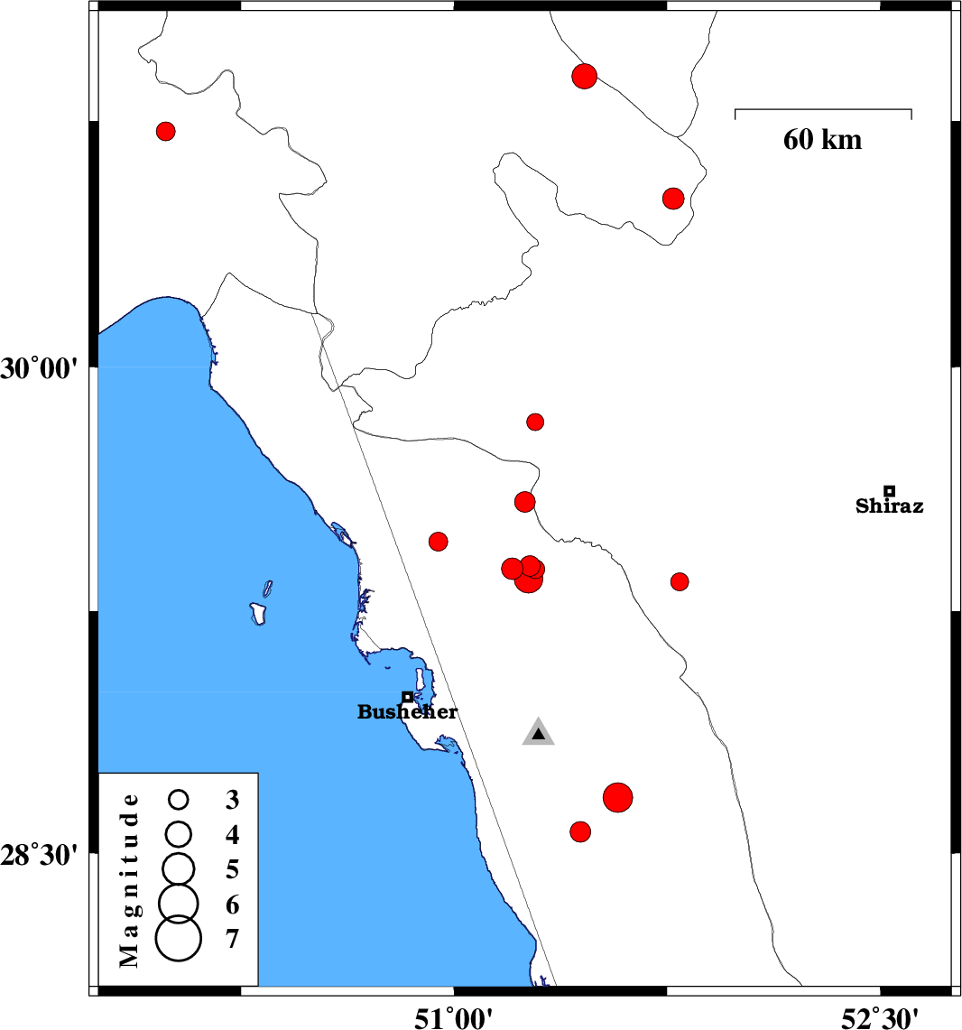 | 2019/01/04 | 16:05:14.1 | 19:35:14.1 | 29.379 | 51.286 | 14 | ML2.9 | Bushehr Province, 15 km North of Borazjan | ||