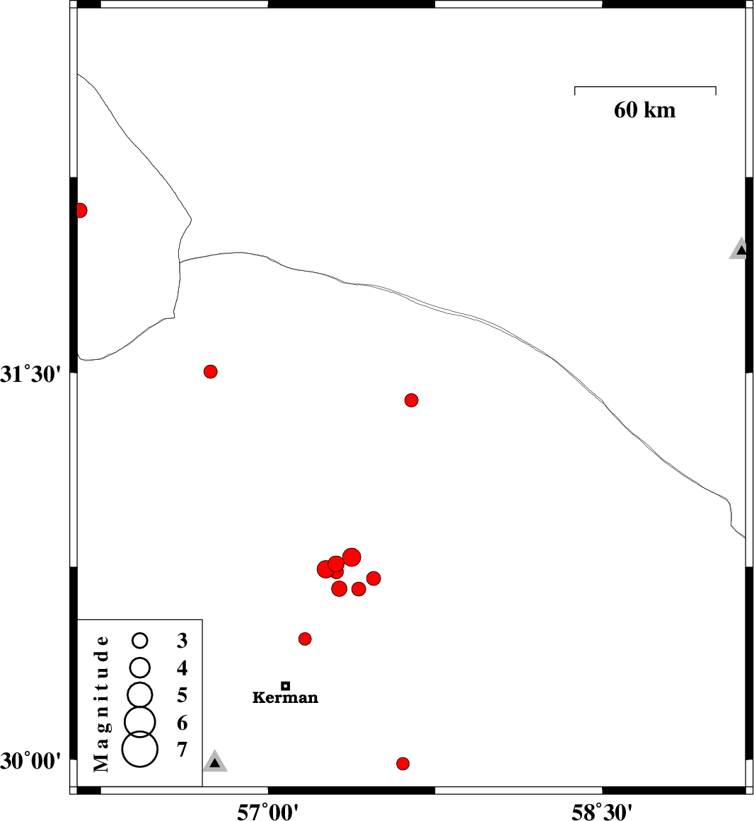 | 2019/01/21 | 18:49:01.6 | 22:19:01.6 | 30.761 | 57.305 | 14 | ML3.2 | Kerman Province, 57 km North-East of Kerman | ||