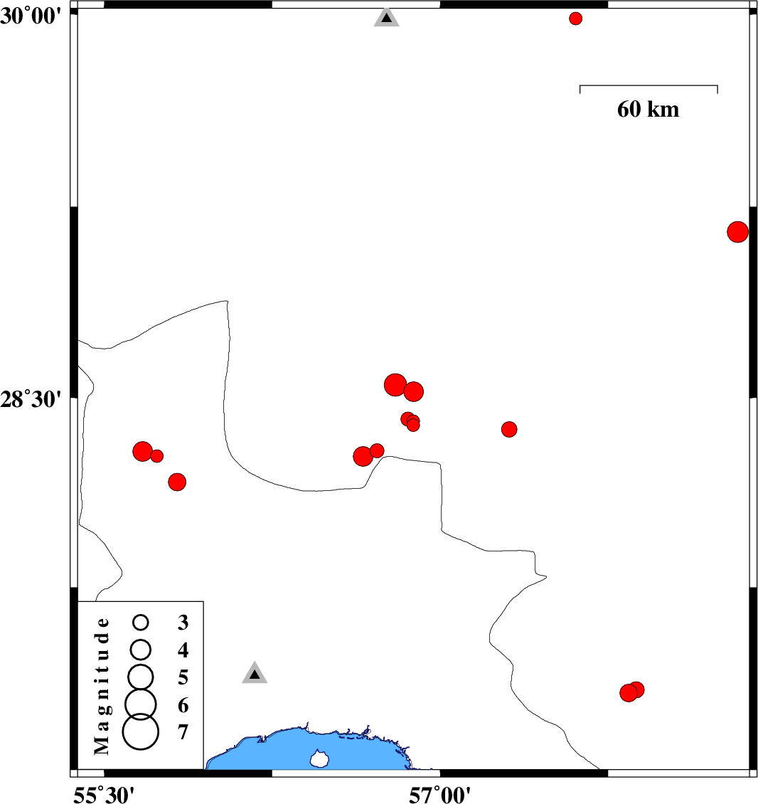 | 2019/01/01 | 01:20:45.5 | 04:50:45.5 | 27.342 | 57.875 | 14 | ML3.2 | Kerman Province, 38 km -East of Manujan | ||
