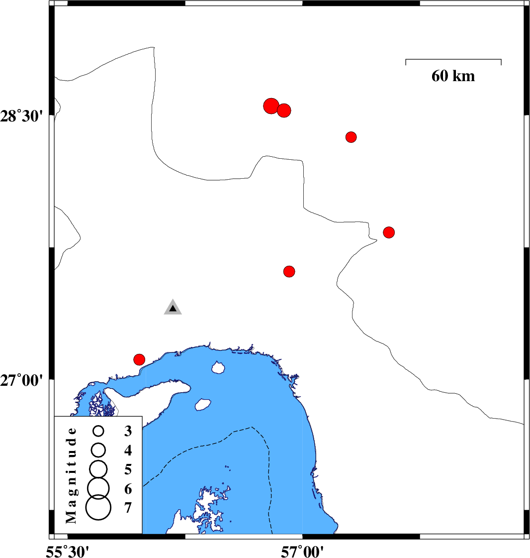 | 2019/01/25 | 13:38:11.2 | 17:08:11.2 | 27.613 | 56.914 | 16 | ML3.2 | Hormozgan Province, 38 km North-West of Dehbarez | ||