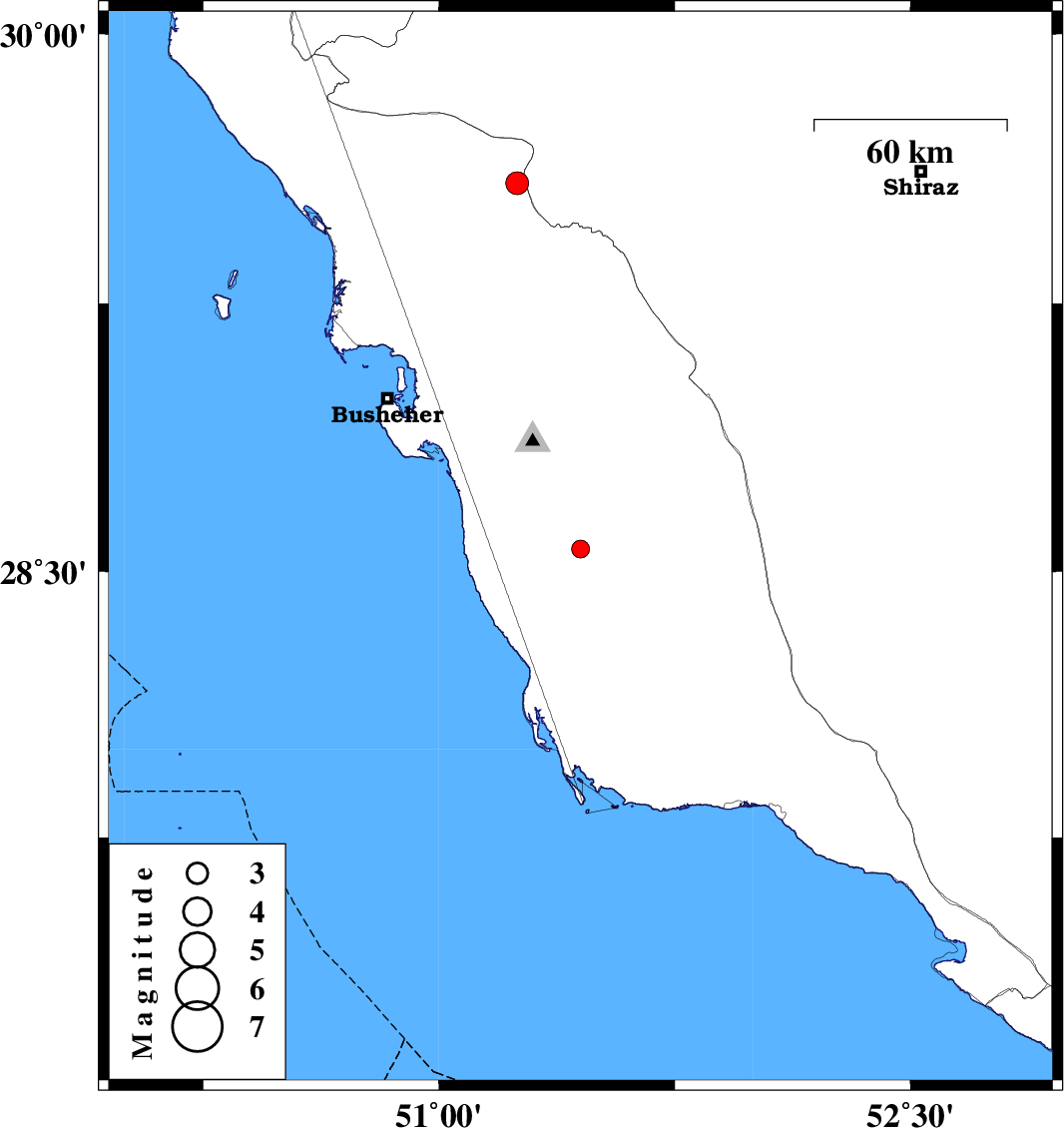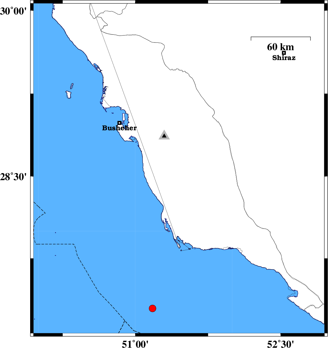 | 2019/01/21 | 22:33:59.8 | 02:03:59.8 | 29.586 | 51.249 | 14 | ML3.2 | Bushehr Province, 36 km North of Borazjan |