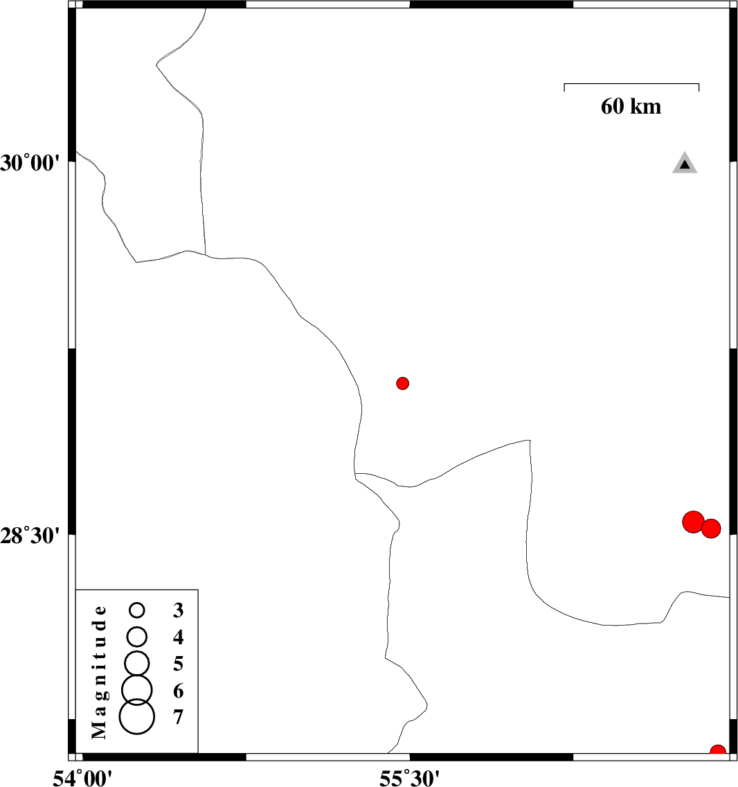 | 2019/01/22 | 23:50:26.2 | 03:20:26.2 | 28.524 | 56.881 | 15 | ML4 | Kerman Province, 83 km South-East of Baft | ||