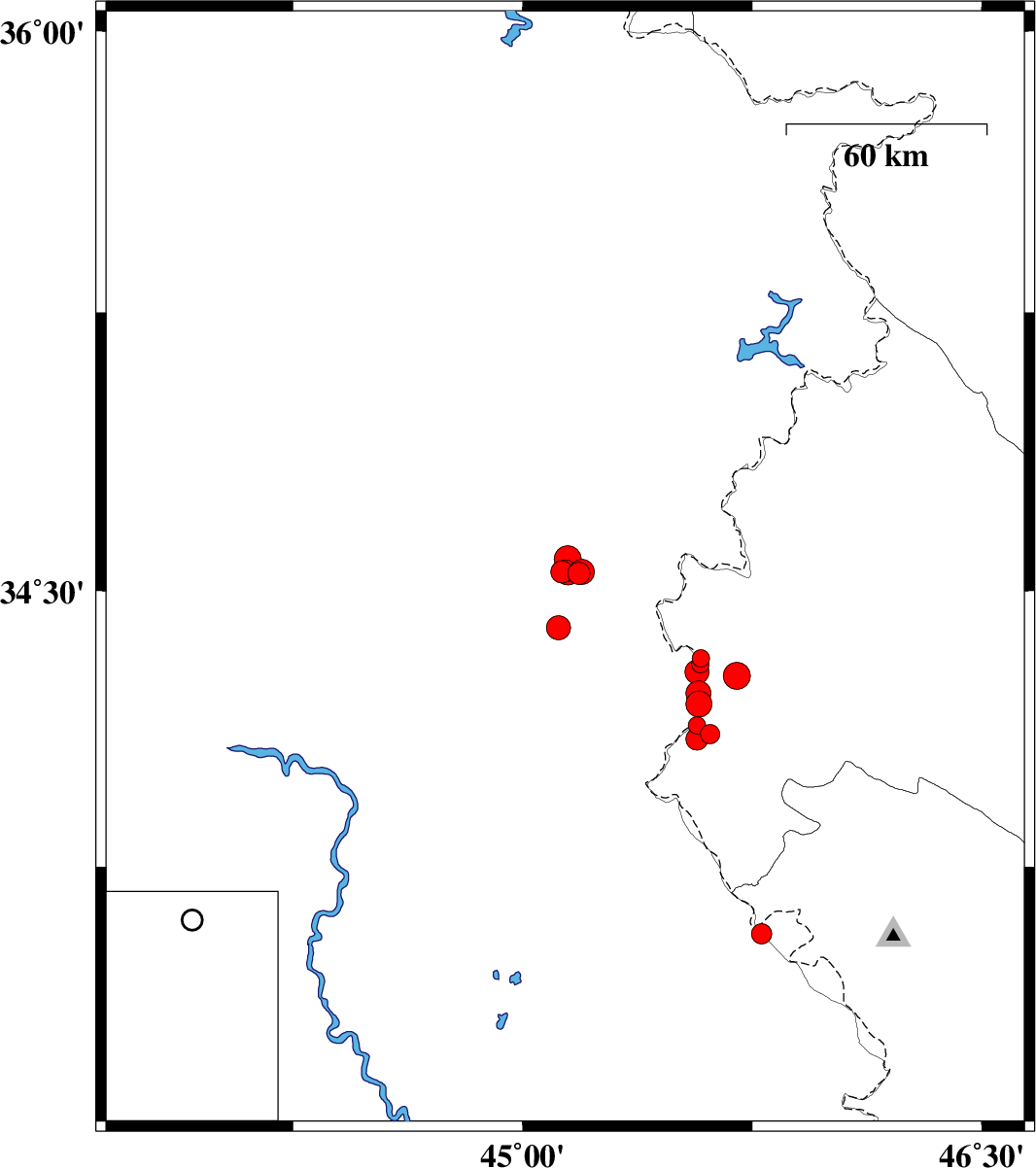 2019/01/29 | 06:02:39.2 | 09:32:39.2 | 34.551 | 45.193 | 18 | ML:3.6 | Iraq, 36 km -West of Qasr-E-Shirin | ||