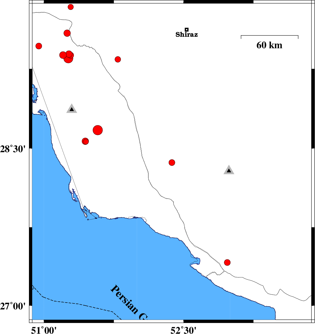 2019/01/05 | 00:32:37.9 | 04:02:37.9 | 29.389 | 51.267 | 16 | ML3.2 | Bushehr Province, 15 km North of Borazjan | ||