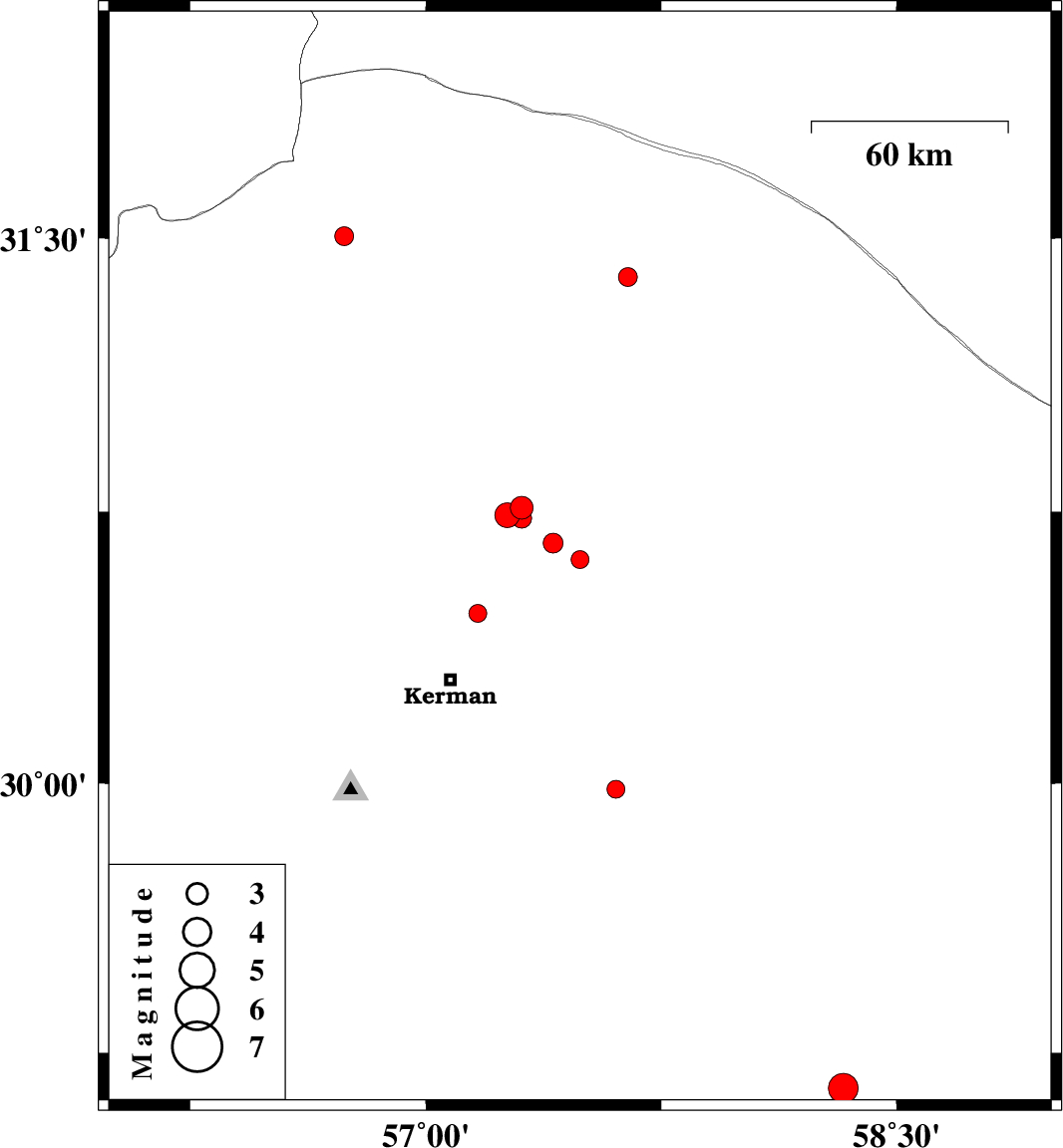 | 2018/12/30 | 06:13:18.3 | 09:43:18.3 | 30.732 | 57.306 | 14 | ML2.8 | Kerman Province, 54 km North-East of Kerman |