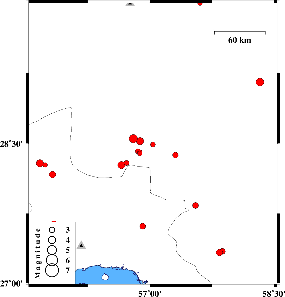 | 2019/01/01 | 01:20:45.5 | 04:50:45.5 | 27.342 | 57.875 | 14 | ML3.2 | Kerman Province, 38 km -East of Manujan | ||