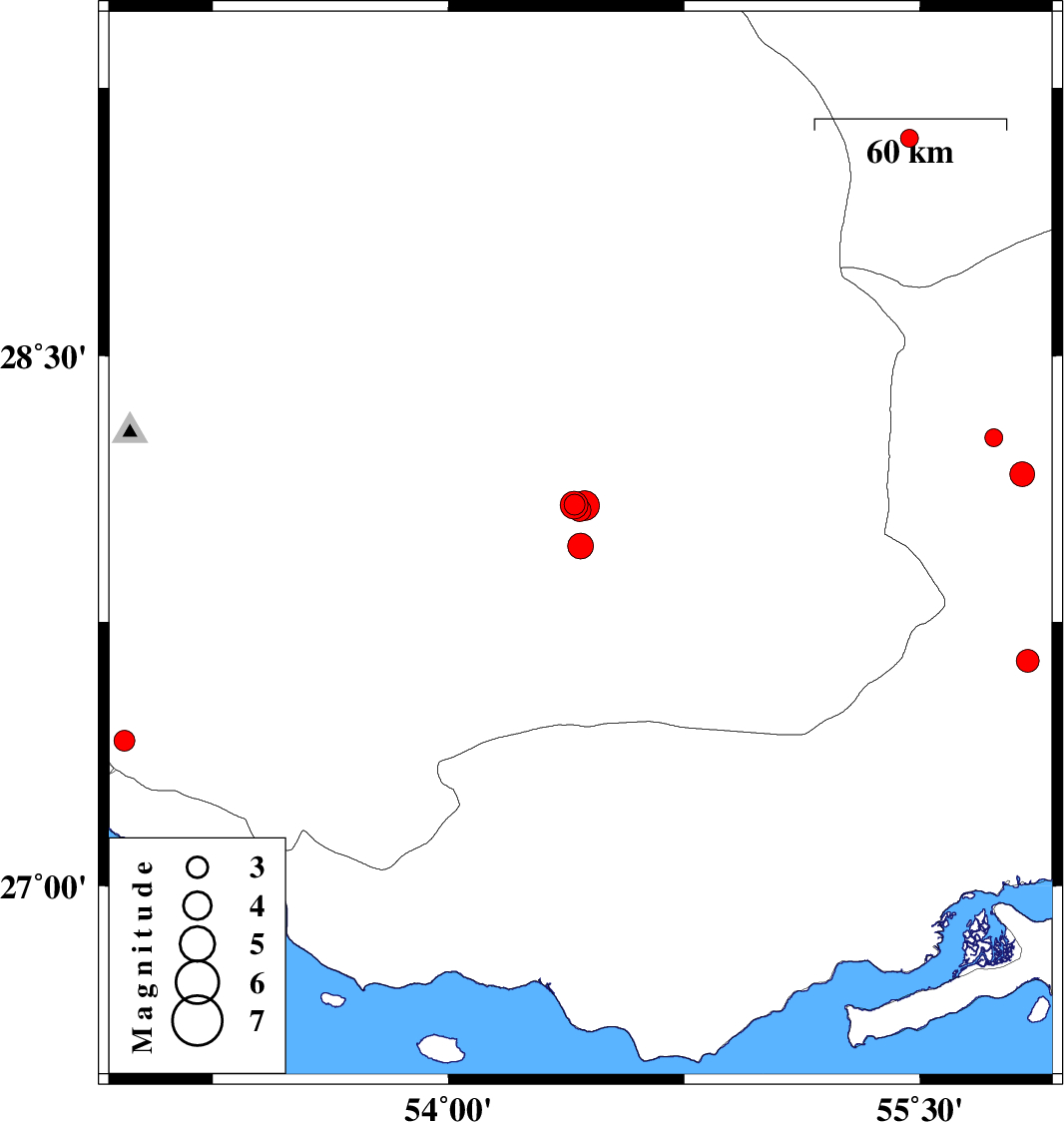 | 2019/01/02 | 15:39:33.1 | 19:09:33.1 | 28.078 | 54.433 | 15 | ML4.3 | Fars Province, 45 km North of Lar |