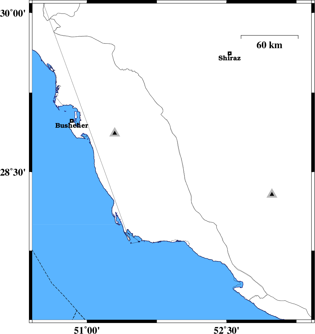 | 2019/01/30 | 22:42:23.8 | 02:12:23.8 | 28.589 | 51.912 | 15 | ML3.3 | Bushehr Province, 36 km South-West of Farashband | ||