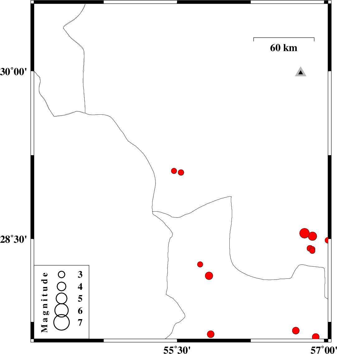 | 2019/01/07 | 22:54:28.5 | 02:24:28.5 | 28.407 | 56.879 | 14 | ML2.6 | Kerman Province, 96 km -East of Hajiabad | ||