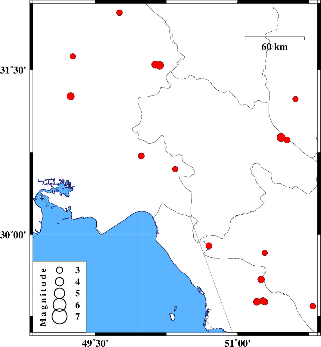 | 2019/01/04 | 16:05:14.1 | 19:35:14.1 | 29.379 | 51.286 | 14 | ML2.9 | Bushehr Province, 15 km North of Borazjan | ||