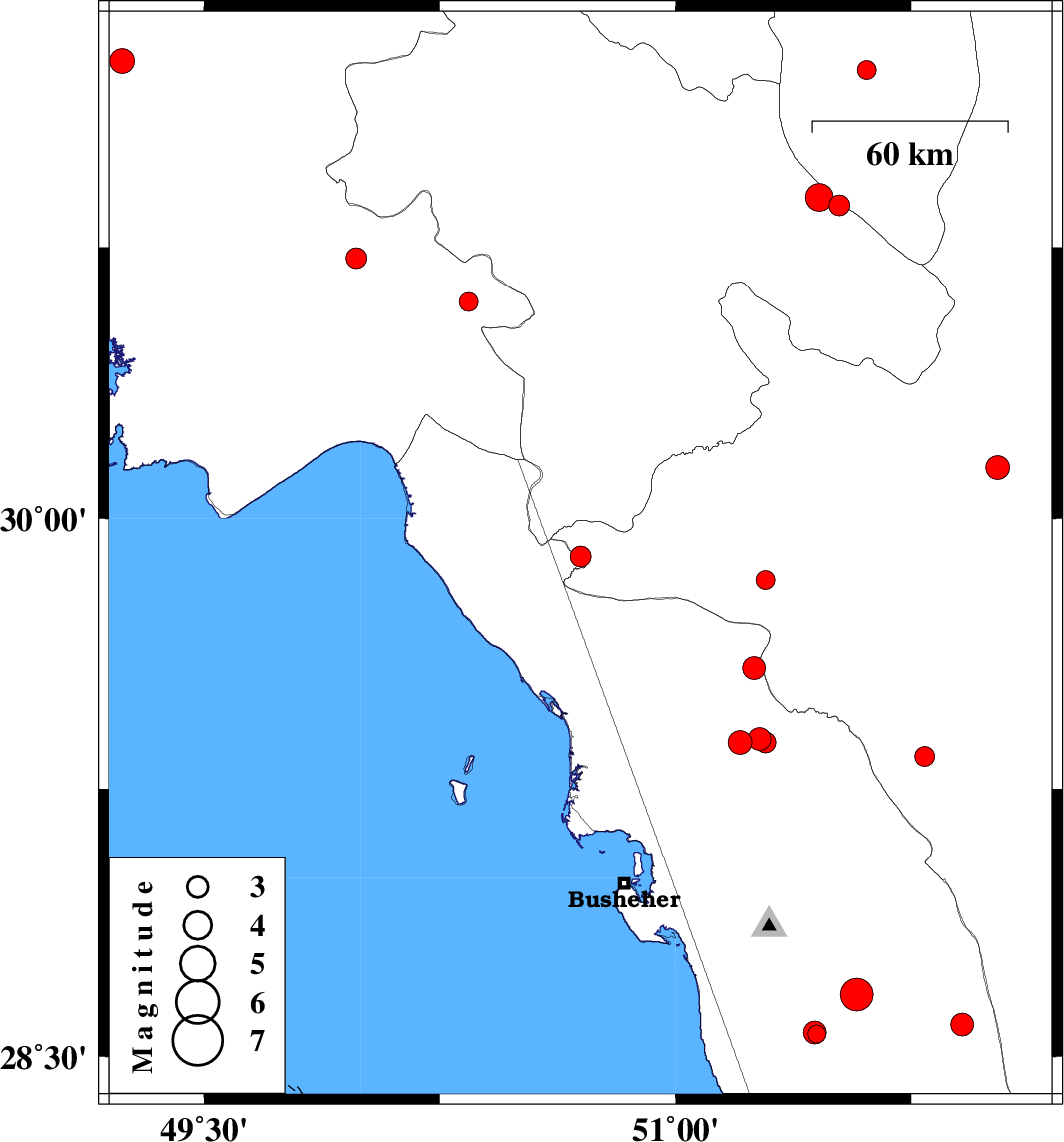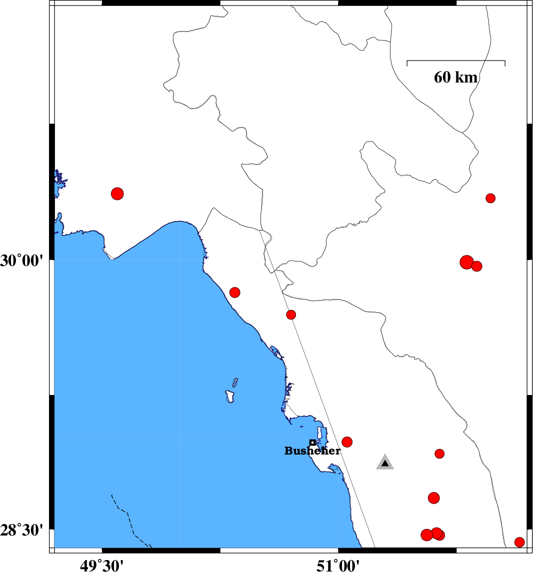 | 2019/01/04 | 16:05:14.1 | 19:35:14.1 | 29.379 | 51.286 | 14 | ML2.9 | Bushehr Province, 15 km North of Borazjan |