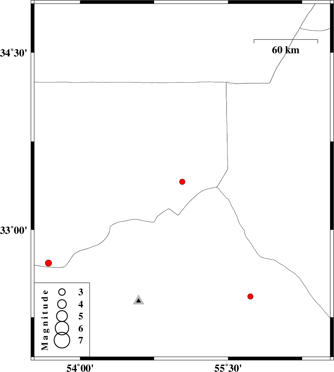 2019/02/04 | 00:32:40.0 | 04:02:40.0 | 33.409 | 55.035 | 14 | ML2.6 | Esfahan Province, 177 km South-West of Tabas | ||