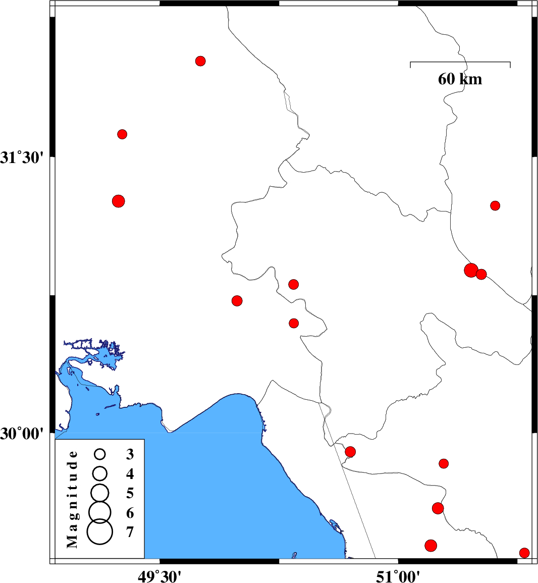 2019/02/02 | 11:38:22.4 | 15:08:22.4 | 30.598 | 50.342 | 15 | ML:2.7 | Khoozestan Province, 9 km of Behbahan | ||