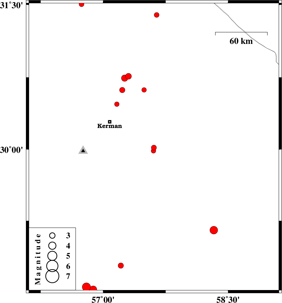 | 2019/01/14 | 01:27:13.9 | 04:57:13.9 | 29.151 | 58.329 | 14 | ML4.2 | Kerman Province, 5 km of Bam | ||