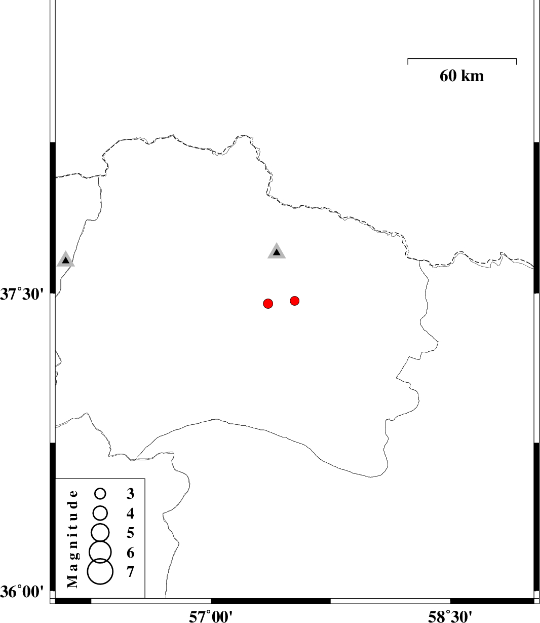 2019/01/27 | 17:50:56.6 | 21:20:56.6 | 37.448 | 57.357 | 14 | ML:2.7 | Khorasan(north) Province, 3 km of Bojnurd |