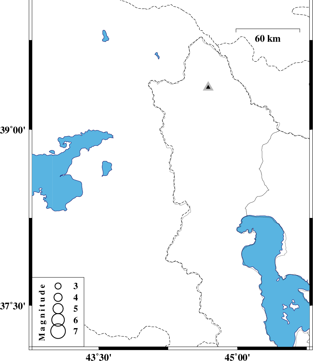 | 2019/02/18 | 16:31:31.8 | 20:01:31.8 | 38.644 | 44.279 | 14 | ML3.9 | Azarbaijan Gharbi Province, 49 km South-West of Seyah Cheshmah |
