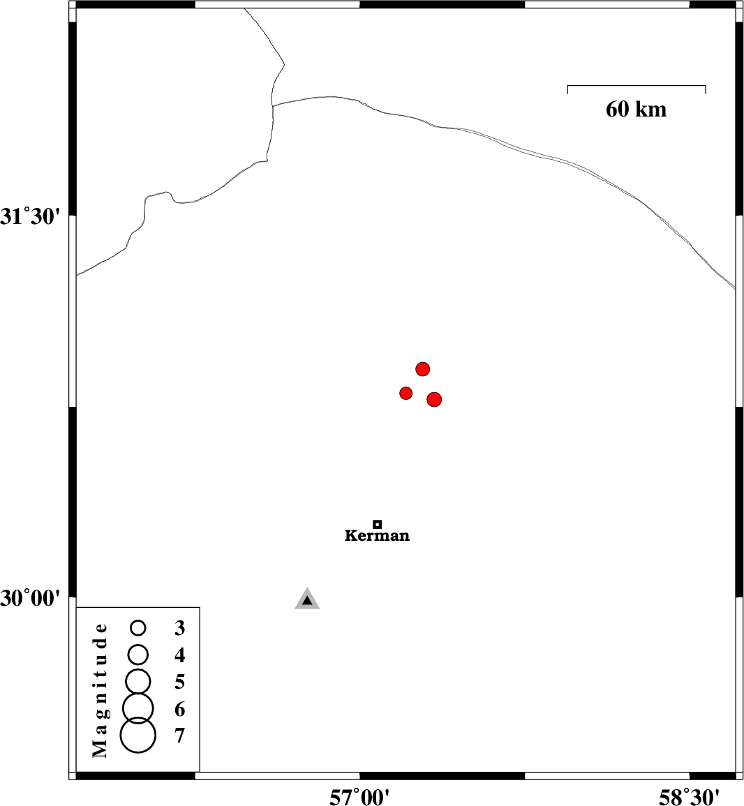 | 2019/02/22 | 11:48:07.5 | 15:18:07.5 | 30.804 | 57.209 | 14 | ML2.5 | Kerman Province, 59 km North-East of Kerman | ||