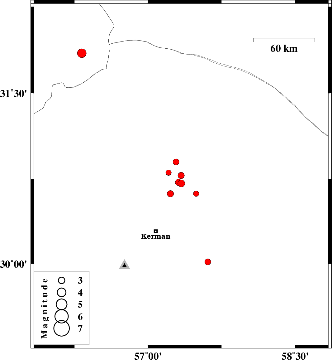 2019/01/28 | 13:39:16.1 | 17:09:16.1 | 30.619 | 57.491 | 14 | ML2.6 | Kerman Province, 54 km North-East of Kerman |