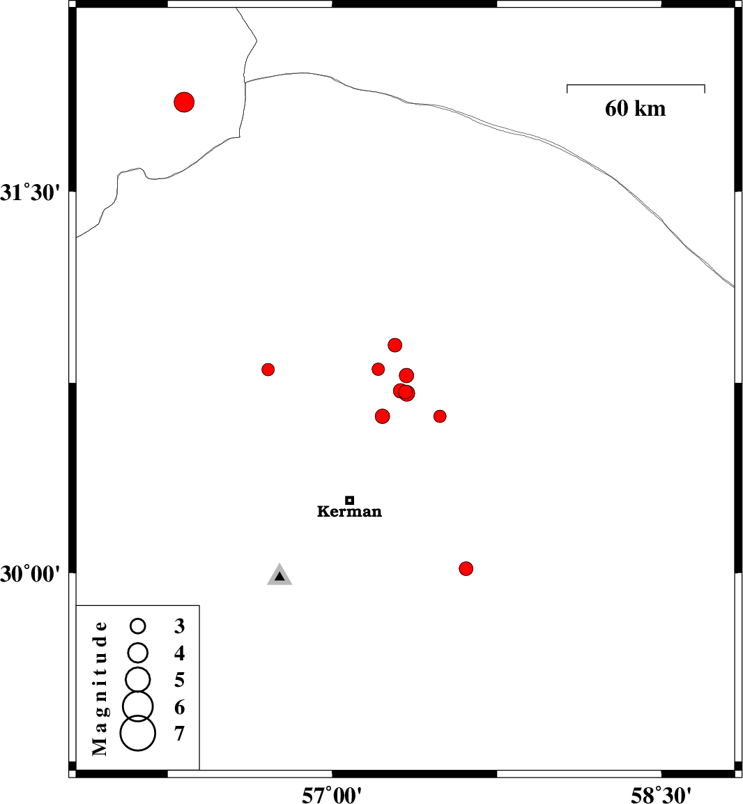 | 2019/01/28 | 13:39:16.1 | 17:09:16.1 | 30.619 | 57.491 | 14 | ML2.6 | Kerman Province, 54 km North-East of Kerman |