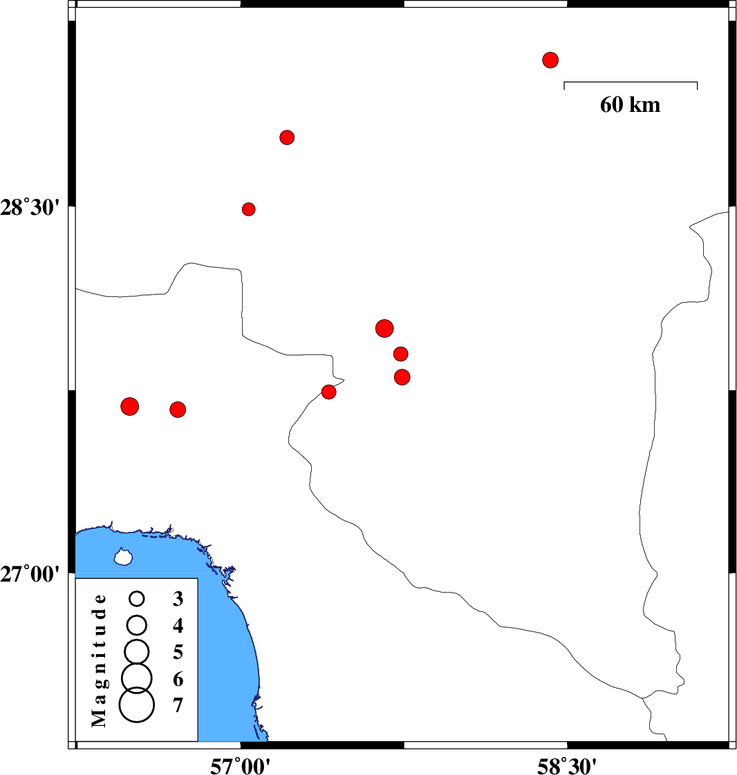 | 2019/01/28 | 15:08:18.8 | 18:38:18.8 | 28.487 | 57.037 | 14 | ML2.7 | Kerman Province, 71 km South-West of Jiroft |