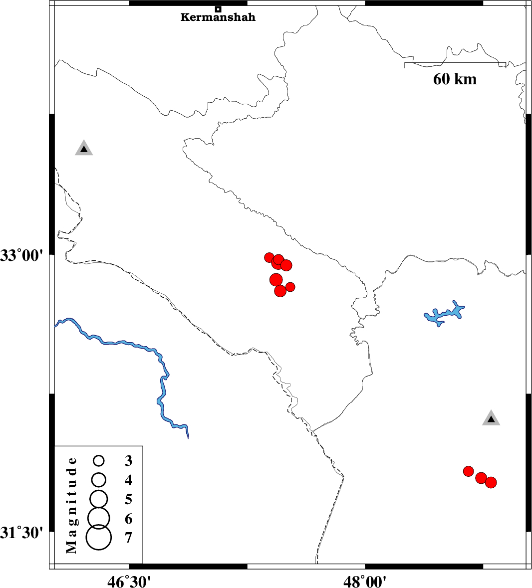 | 2019/02/23 | 01:00:11.5 | 04:30:11.5 | 31.829 | 48.657 | 15 | ML3 | Khoozestan Province, 30 km South-West of Shushtar | ||